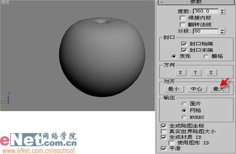 2、選擇line01,進入“修改”命令面板,在“修改器列表”下拉框中選擇“車削”項,進入其屬性面板,修改其對齊參數,如圖2所示。