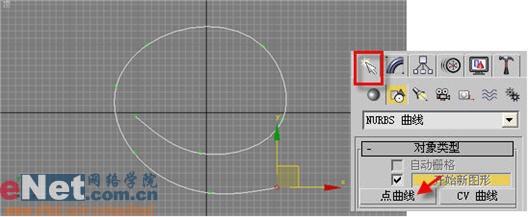 1、啟動3dmax9.0,點擊“創建”命令面板中的“圖形”按鈕,在下拉列表中選擇“NURBS曲線”項,點擊“點曲線”按鈕,在頂部視圖中繪制一曲線Curve01,最后點擊右鍵結束繪制。如圖1所示。