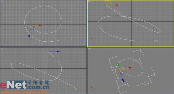 2、點擊“修改”按鈕進入其命令面板,單擊“NURBS曲線”下級目錄項“點”,按下“選擇并移動”按鈕,在視圖中逐步調整曲線中的每個點,使其產生空間上的變化,是為了增大動畫幅度,如圖2所示。
