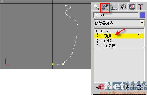 2、點擊“修改”命令面板,打開“Line”的下級項選擇“頂點”。右鍵線條的每一個頂點,將其定義為bezier后分別用“選擇并移動”工具進行調(diào)整,使其外形如圖2所示。