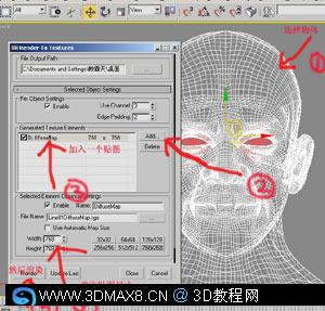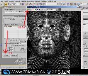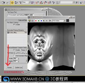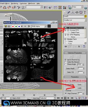 然后渲染得到想要的效果,最后保存貼圖。然后就可以拿到photoshop中處理了。注意,將原始物體的修改器,全部去處,然后加入展開貼圖坐標,load出剛才保存的坐標,指定一個貼圖,這時保存的貼圖就可以用了。