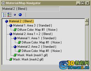 舉例來(lái)說(shuō),Area1區(qū)域(使用1號(hào)貼圖通道)應(yīng)用給模型整體(將其放在Blend混合材質(zhì)的第層內(nèi))。然后將用在模型中第一個(gè)分支上的Area2區(qū)域的貼圖放在混合材質(zhì)的第二層。之后使用第一個(gè)蒙版MAsk1.gif,放在Mask蒙版層內(nèi),這樣就使主干和分支分別很好的對(duì)應(yīng)上了1號(hào)貼圖和2號(hào)貼圖。之后,再制作一級(jí)Blend混合材質(zhì),使Area1區(qū)域和Area2區(qū)域的貼圖再與Area3區(qū)域進(jìn)行混合,并使用第二幅Mask2.gif作為蒙版,下圖就是這個(gè)材質(zhì)的結(jié)構(gòu)層級(jí)圖。