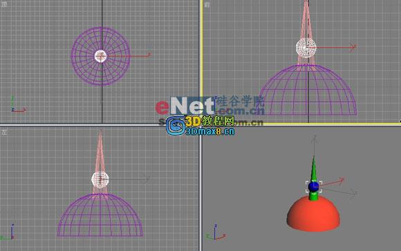 1、打開3DMAX7.0(如果沒有這軟件可以在本站下載:/html/soft/RJCJ/20070422/37.html),單擊創建面板下的幾何體按鈕,然后選擇球體按鈕,在場景中創建一個球體;接著選擇幾何體下的圓錐體按鈕,在場景中創建1個圓錐體,設置半徑1為800,半徑2為0,高度為7500,高度分段數為5,端面分段為1,邊數為24,再次在場景中創建1個球體,設置半徑為900,分段為24。效果如圖1所示: