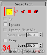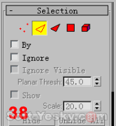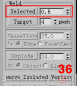 選上面的八分之一,點擊修改命令面板中的Attach按鈕(在Detach按鈕旁邊),將它與下面的八分之一結合在一起,點擊修改命令面板中的點層級按鈕(圖34),框選中間緯度的全部點,一定要記得要框選(圖35),在修改命令面板中找到如圖所示位置(圖36),將Selected后的數值改為0.5,然后點擊Selected按鈕,將兩個八分之一的對應的點焊接起來。