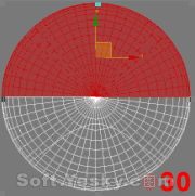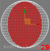 選擇該球體,在球體上點鼠標右鍵選擇Convert To/Convert to Editable Mesh,將球體轉化為可編輯的網格物體,在修改命令面板中點擊多邊形層級按鈕(操作可參考足球的制作)。此時,剛被壓印的球面上的橢圓形區域會自動選擇出來(圖29)。