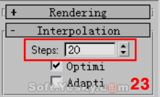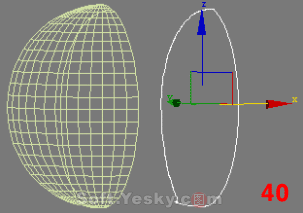先在頂視圖(Top)中創建一個半徑為100,段數為52的球體(Sphere),切換到前視圖(Front),在前視圖中創建一個長(Length)為191,寬(Width)為141.4的橢圓形形體,點開Interpolation一項,將Steps值設為20,讓橢圓更加圓(圖23)。