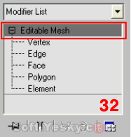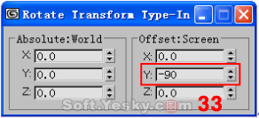 此時剩下了兩個球的八分之一部分,完全框選右下的八分之一部分的多邊形,點擊修改面板中的Detach按鈕(可參考排球的制作),將這個八分之一拆除出來。出現的對話框點擊OK按鈕,回到網格物體的最頂級,及用鼠標點擊層級面板中的Editable Mesh(圖32),這樣,我們就可以選擇剛剛拆除出來的那個八分之一,選取它,點工具欄上的旋轉按紐,然后再在上面點右鍵,會出來一個對話框,在右邊一欄中的Y一項中輸入-90,然后回車,將此八分之一旋轉過去和上面的八分之一對齊。(圖33)
