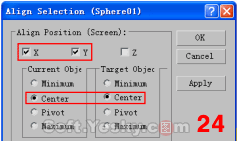 用對齊命令,將橢圓形的X、Y中心方向對齊球體(如圖24)。