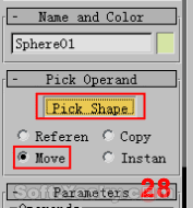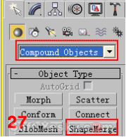 再切換到前視圖,選擇球體,點選創建面板中的Compound Objects,然后點擊ShapeMerge按鈕(圖27),將鼠標移下來,選擇Move方式,點擊Pick Shape按鈕,點選前視圖中的橢圓形,然后按兩下鼠標右鍵結束此命令(圖28)。此時,球面上刻下了一圈橢圓形的印。