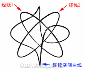 在做籃球之前還是要先學會觀察,籃球的球面有兩條經線,將籃球分割成四瓣,剩下的是一條連續的空間曲線,如下圖所示: