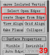 然后點擊修改命令面板中的Detach鍵,將它拆除出來。出來對話框點OK按鈕。回到網格物體的最頂級,選擇剛拆除出來的那個網格物體,點擊修改命令面板中的邊層級(圖38),然后在修改命令面板中找到如圖所示位置(圖39),先點擊Select Open Edge按鈕,然后在點擊Create Shape from Edge按鈕,這樣就會創建出一條空間曲線,