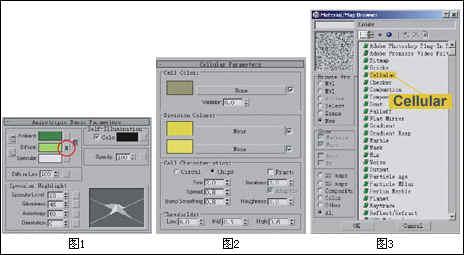 我們選用Anisotropic作為梨的基本材質,相應的參數面板如圖1,調節好高光特性之后,點擊漫反射通道上的貼圖按鈕如圖1所示,調用貼圖和材質選擇框,如圖3;選擇其中的Celluar紋理貼圖;得到子一級的貼圖參數面板如圖2,目前所顯示的是應用于梨表面的Celluar貼圖,各項參數均已調整好了,只要分配給場景中梨的模型就大功告成了。