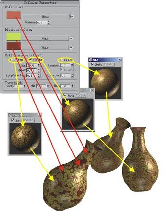 另外,Celluar貼圖參數面板上還有幾個參數也是很重要的。下圖中,左邊的梨紋理的Spread參數值=0.40,而右邊梨紋理的Spread參數值=0.80;中間梨紋理的Size=8.0,而右邊的Size=2.0。