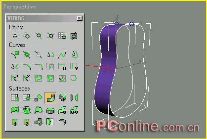 1、打開3DS MAX5軟件,單擊工具欄中的SHAPES鈕,在其下的下拉列表中選擇NURBS CURVES項,然后按下CV CURVE鈕,在FRONT視圖中畫出吉它主體部分的輪廓線,如圖JT1所示。