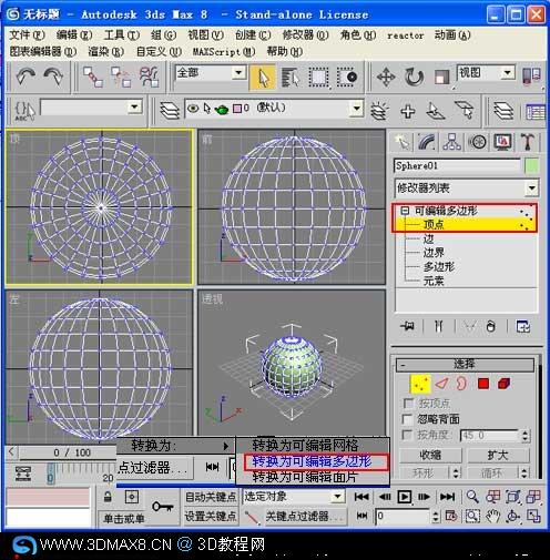 1-2、對著球體右鍵,將球體轉為可編輯多邊形,并進入點層級狀態;