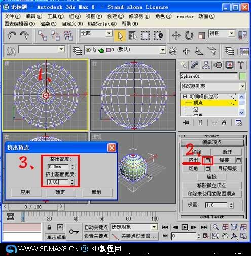 1-3、在頂視圖中框選中心那個點,再點擠出按鈕,擠出參數如圖所示;