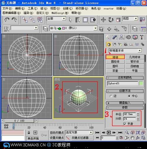 1-1、 放入一個球體,參數如圖 ,并讓球體以邊面顯示出來(24這個分段數就是仙人球經線數,也就是仙人球的瓣數為12,可自定);