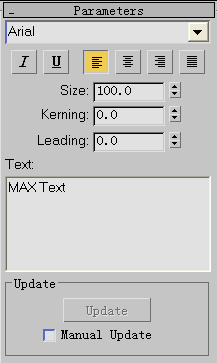 二維圖形也是參數對象,在創建之后也可以編輯二維對象的參數。例如,圖2.29給出的是創建文字時的Parameters卷展欄。可以在這個卷展欄中改變文字的字體、大小、字間距和行間距。創建文字后還可以改變文字的大小。