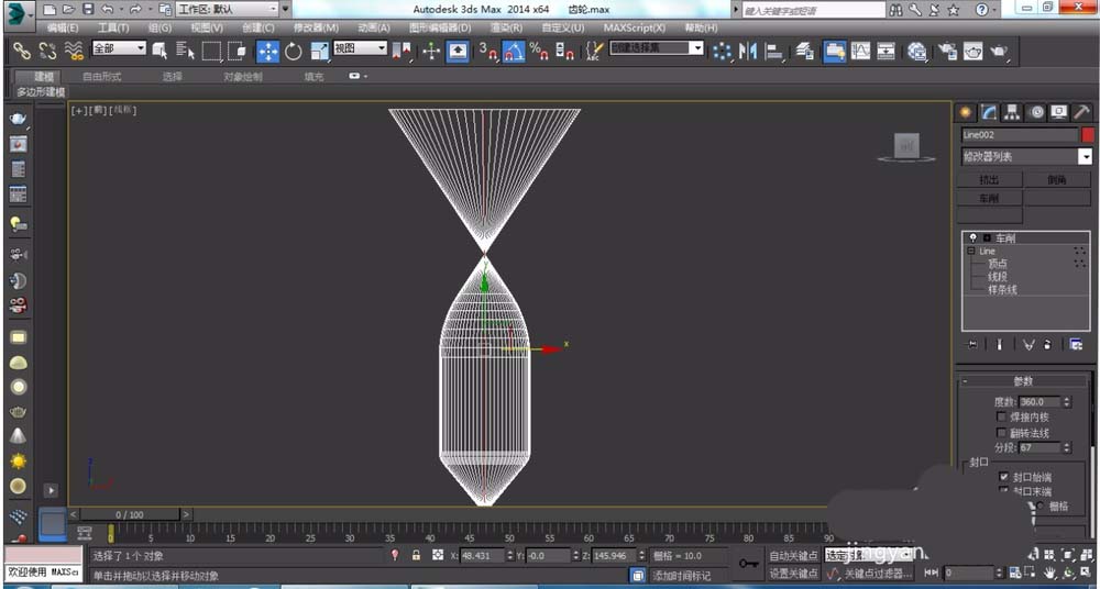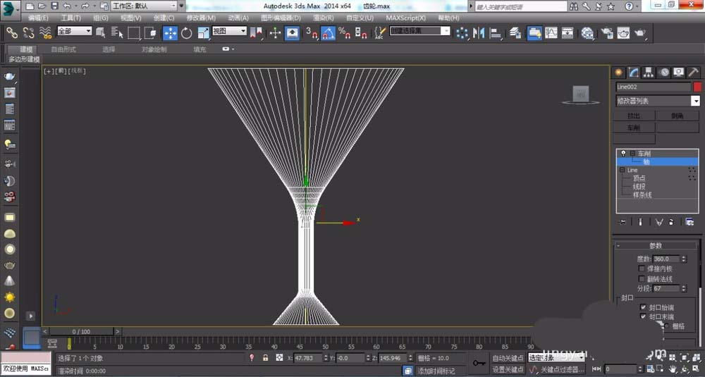3、選擇這個可編輯樣條線,點擊修改面板中的車削修改器,進行車削命令,如下面圖紙所示。