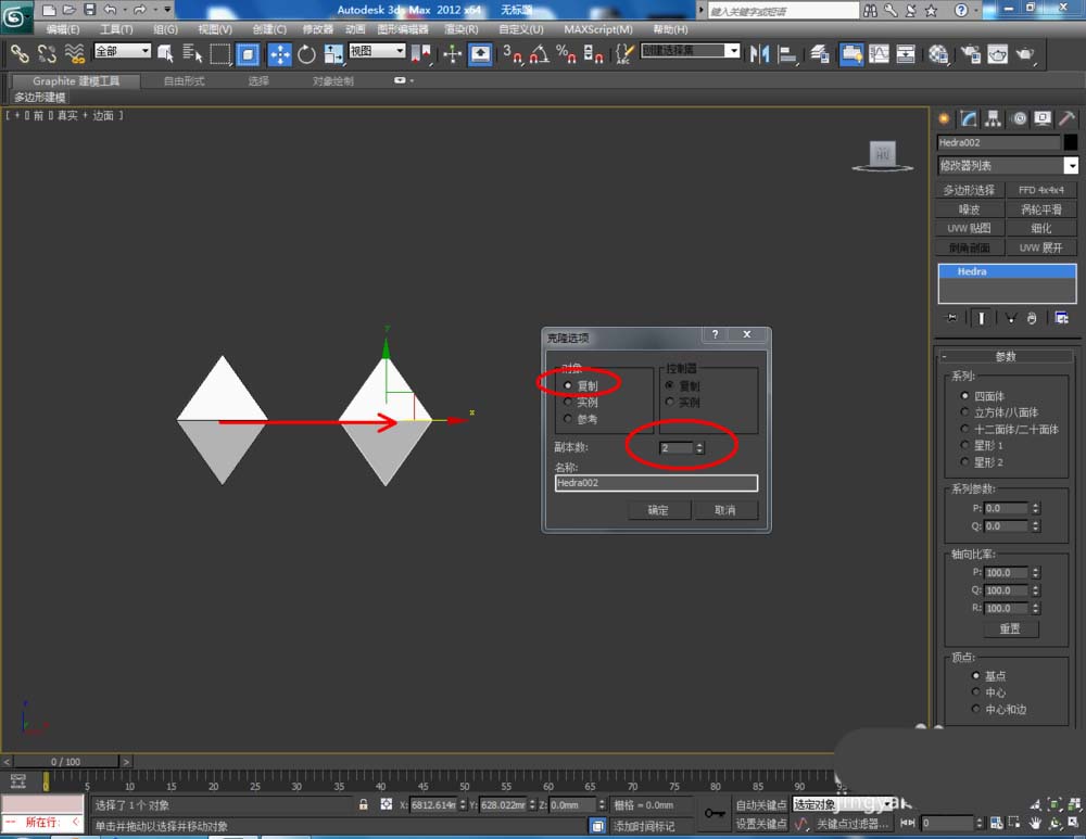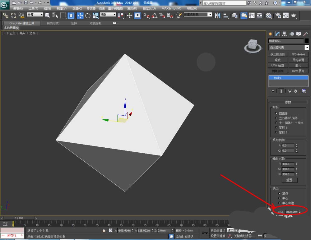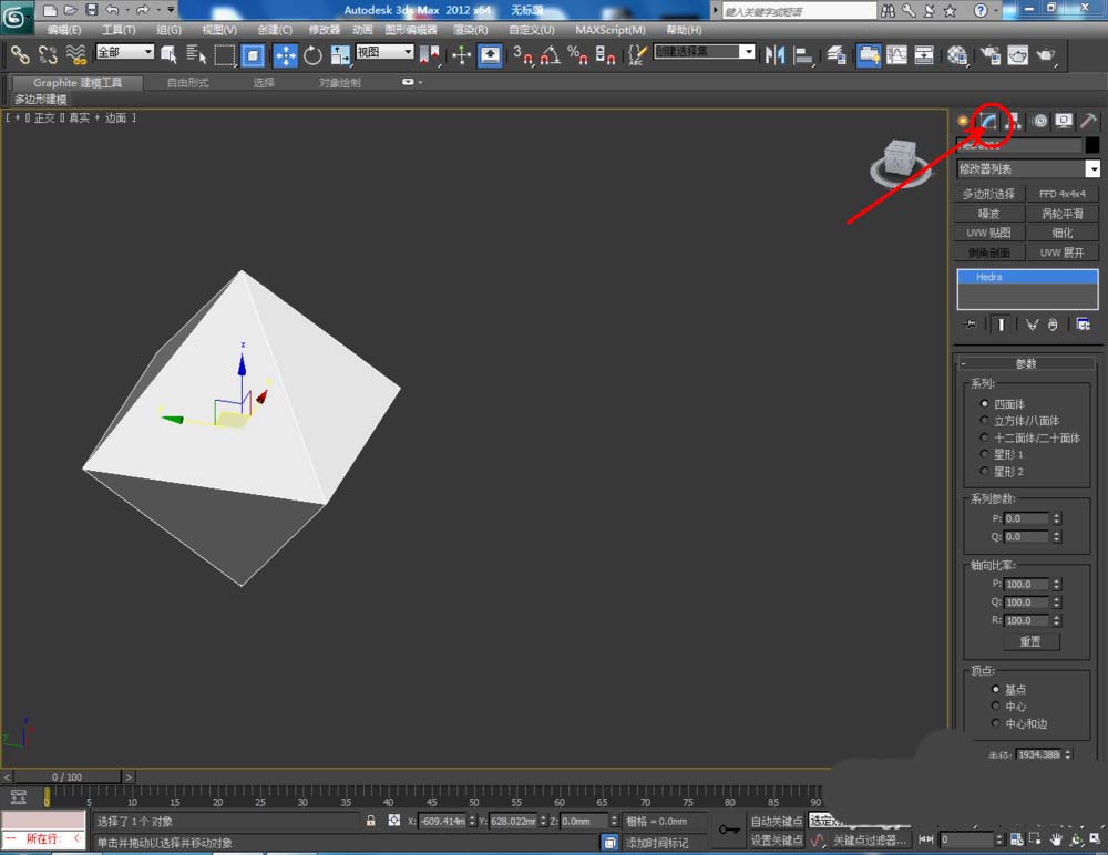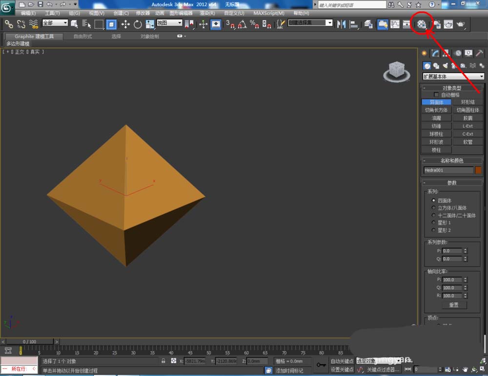 1、打開3Dmax2012軟件,點(diǎn)擊【創(chuàng)建】-【幾何體】-【擴(kuò)展基本體】-【異面體】,勾選四面體后,在作圖區(qū)域繪制一個基本體模型(如圖所示);