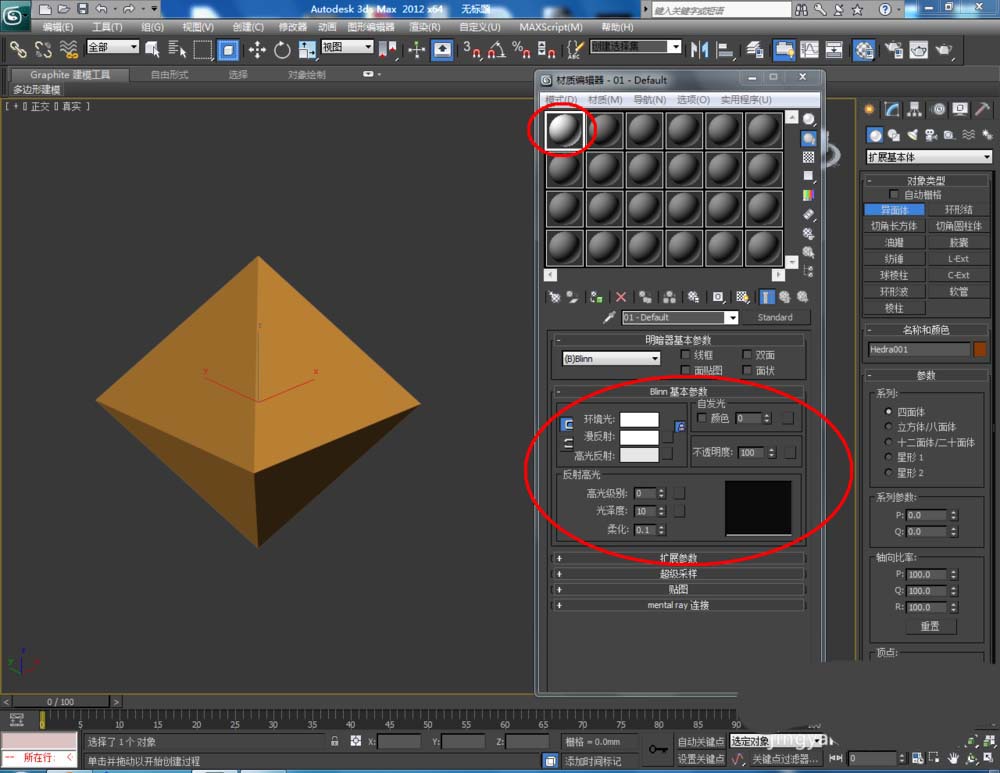 2、點(diǎn)擊【材質(zhì)編輯器】,彈出材質(zhì)編輯器設(shè)置框,按圖示參數(shù)設(shè)置一個白色材質(zhì)球并附加給模型。選中模型,點(diǎn)擊【對象顏色】,將模型對象顏色設(shè)置為黑色(如圖所示);