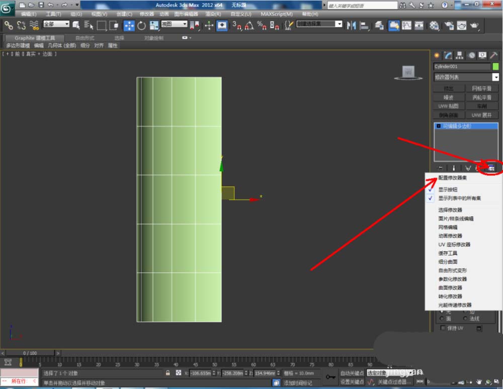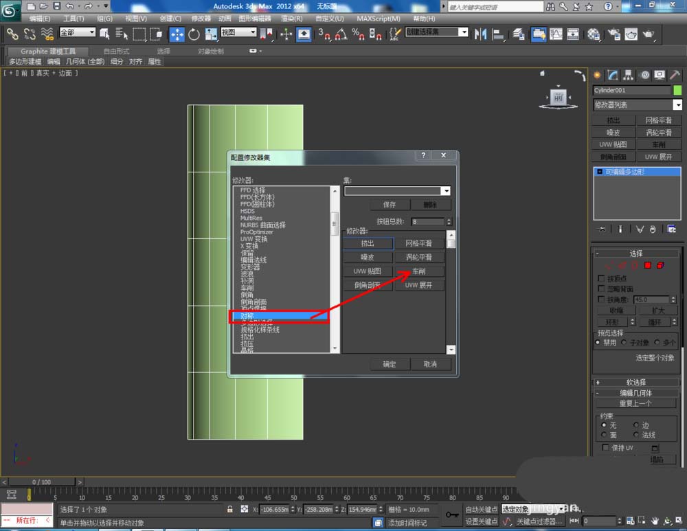 3、點擊【修改】-【配置修改器集】,彈出配置修改器集選擇欄,找到【對稱】并將其拉動到右邊選項欄中,點擊【確定】將【對稱】功能調出(如圖所示);