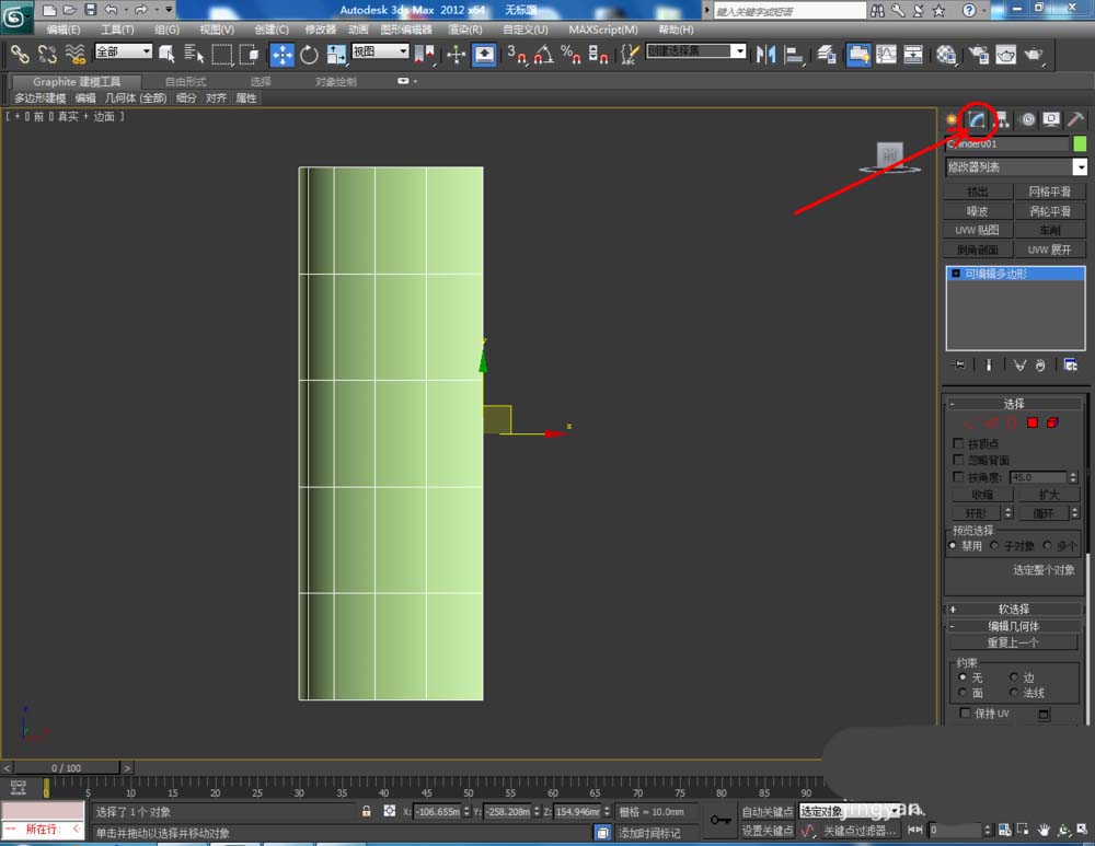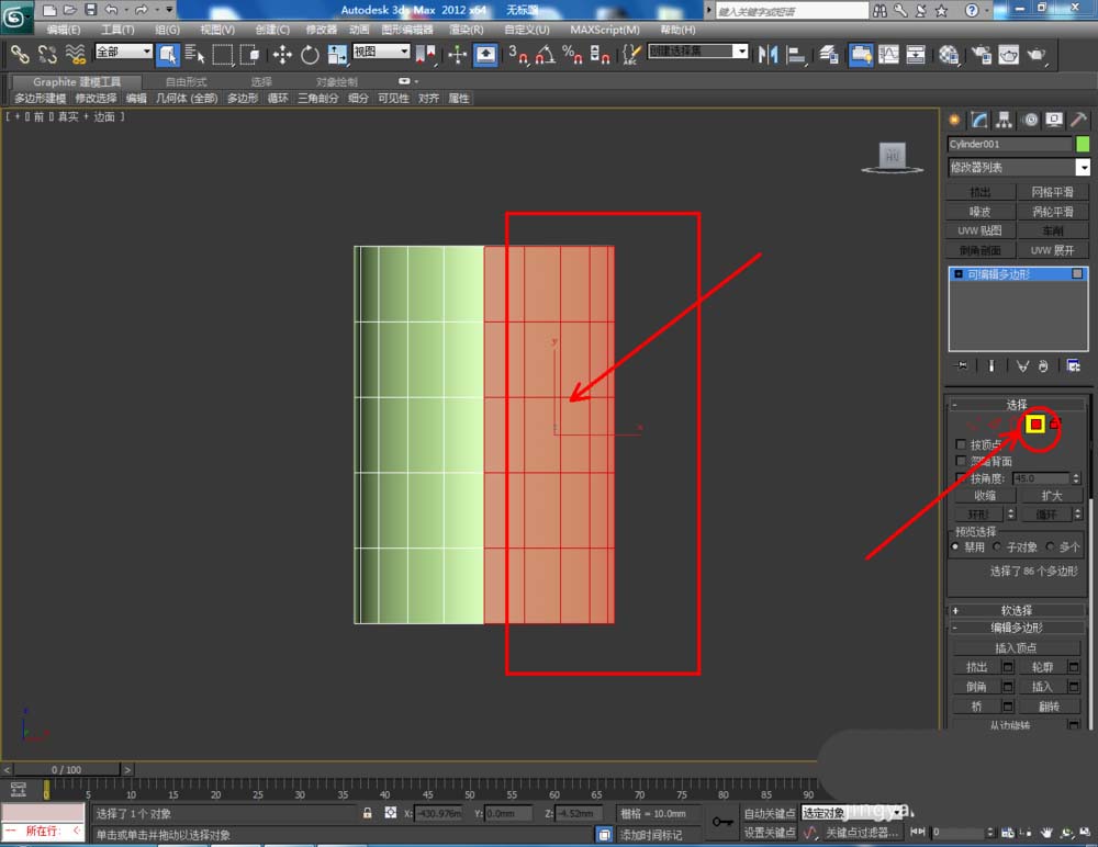 2、選中模型,點擊鼠標右鍵-【轉換為】-【轉換為可編輯多邊形】。點擊【面】圖標,按圖示框選模型上一半的面并進行刪除。點擊【層次】-【軸】-【僅影響軸】,按圖示對模型的軸進行移動(如圖所示);