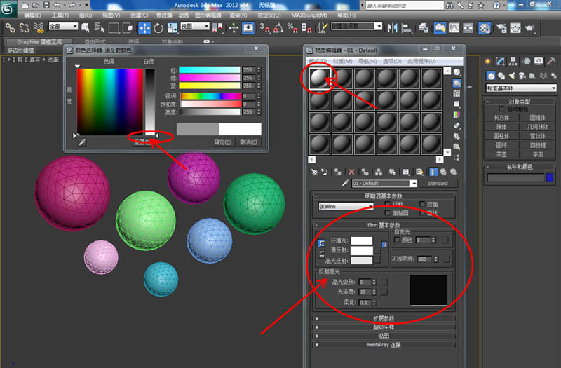 2、點擊【材質編輯器】,彈出材質編輯器設置欄,按圖示參數設置一個白色材質球并附加給所有球體。選中所有球體模型,點擊對象顏色,將所有球體的對象顏色設置為黑色(如圖所示);