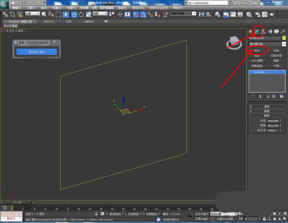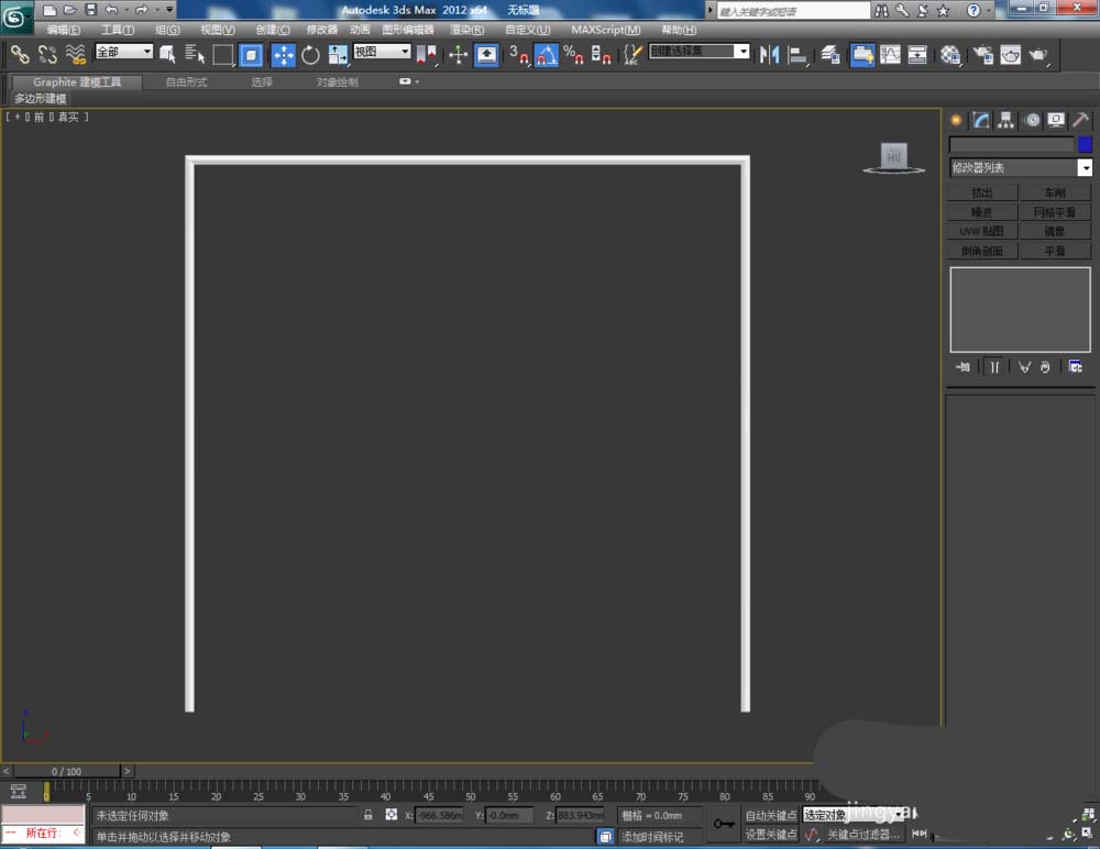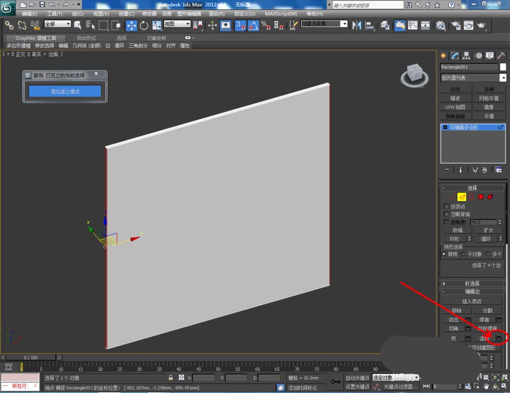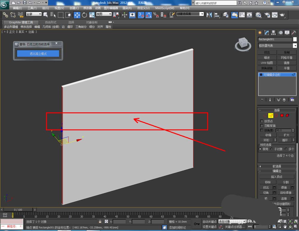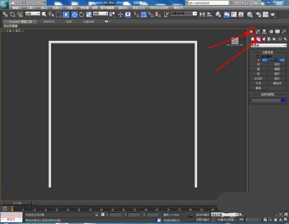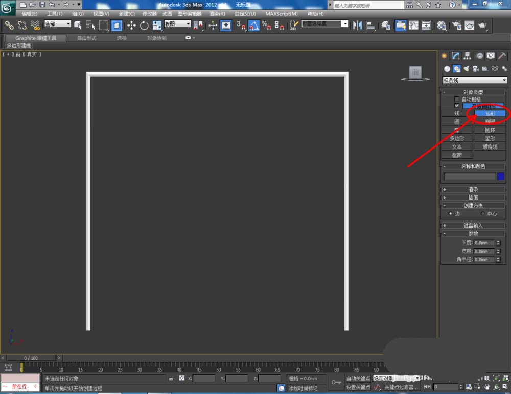 1、打開3Dmax2012軟件,我們將對裝飾線中間的硬包部分進行制作。點擊【創建】-【圖形】-【矩形】,在裝飾線區域繪制一個矩形圖案。按住鍵盤【Alt+Q】鍵盤,將圖案孤立出來;