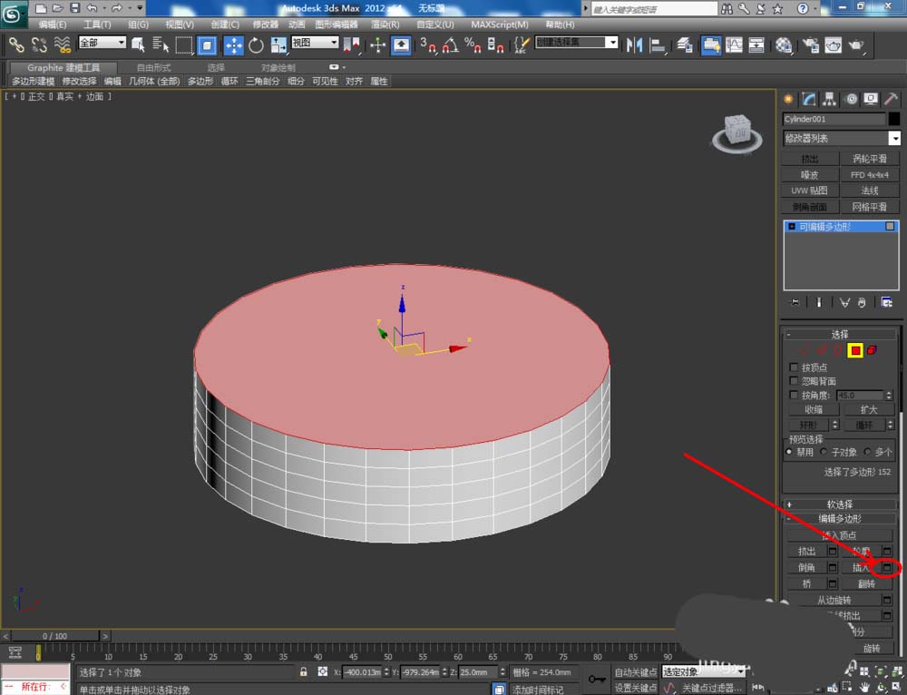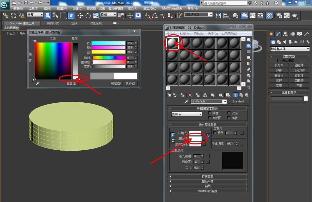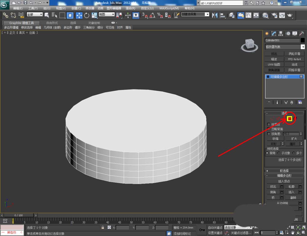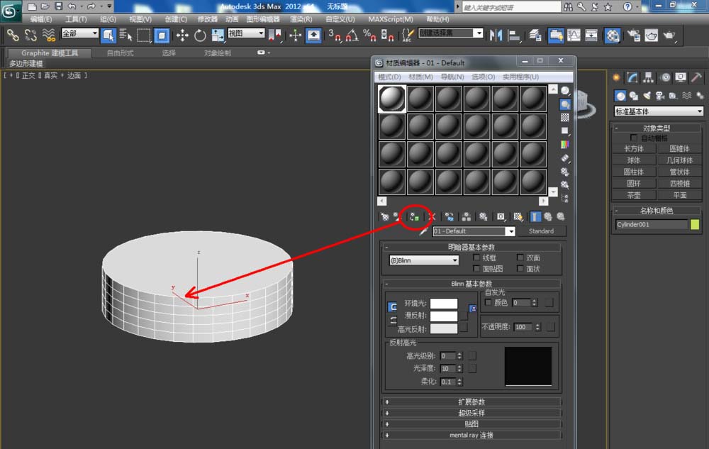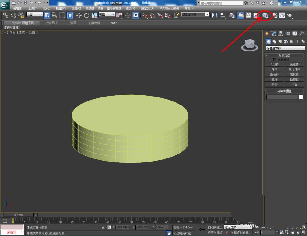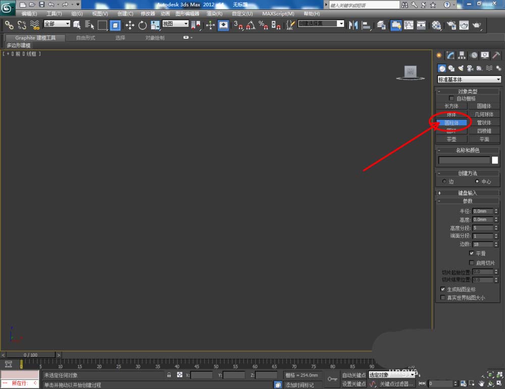1、打開3Dmax2012軟件,點擊【創建】-【幾何體】-【標準基本體】-【圓柱體】,在作圖區域繪制一個圓柱體模型并按圖示設置好圓柱體的各個參數;