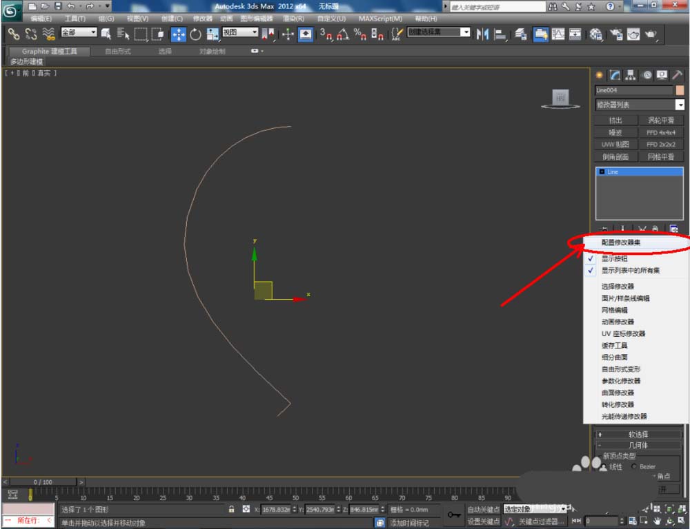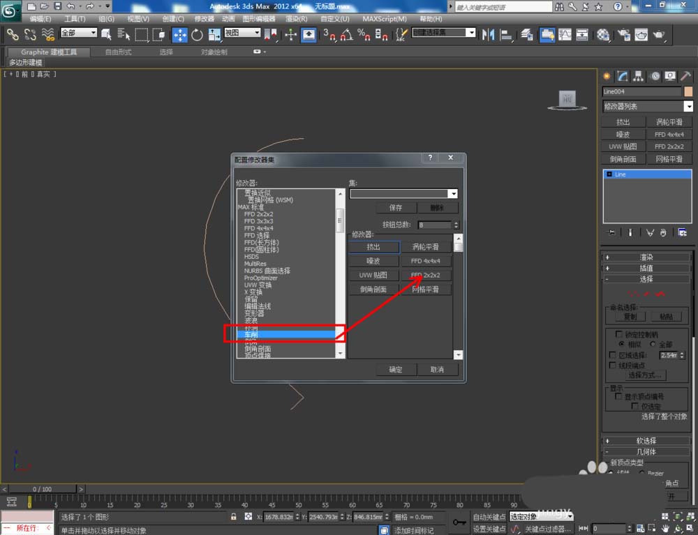 2、點擊【修改】-【配置修改器集】,彈出配置修改器集選項欄,找到【車削】并將其拉動到右邊的選項欄中,點擊【確定】將車削調(diào)出;