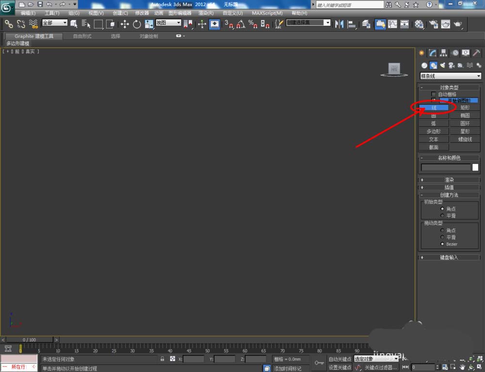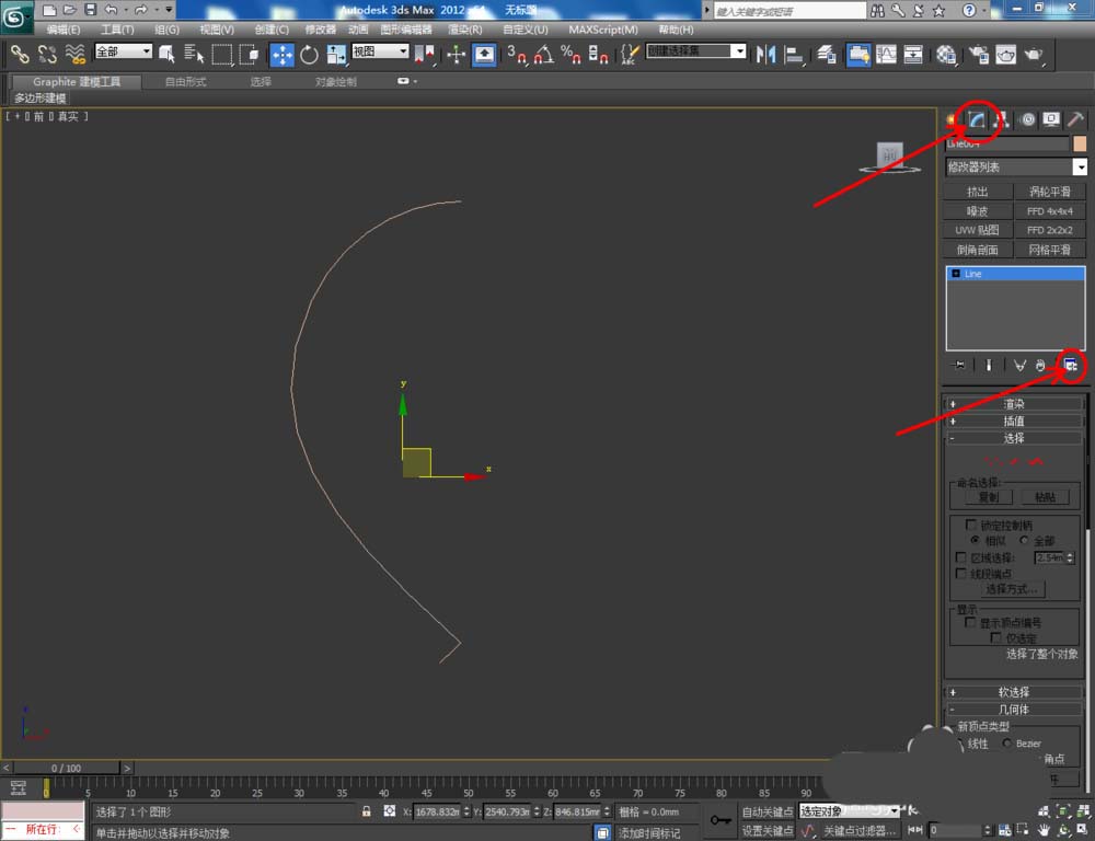 1、打開3Dmax2012軟件,點擊【創(chuàng)建】-【圖形】-【線】,在作圖區(qū)域繪制出一條線。點擊【點】圖標(biāo),選中圖示三個點并進(jìn)行平滑圓化處理(如圖所示);