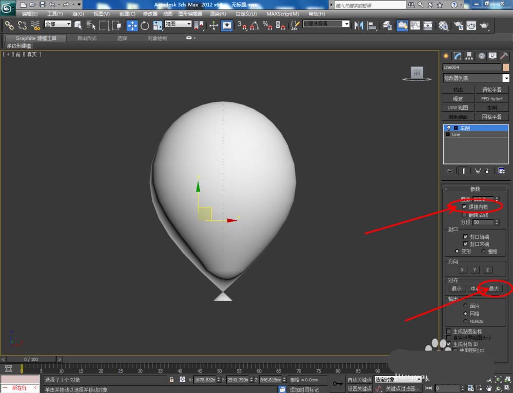 3、選中圖案,點擊【修改】-【車削】,勾選【焊接內(nèi)核】分段數(shù)設(shè)置為:50后,點擊【最大】,建立起氣球模型基本體(如圖所示);