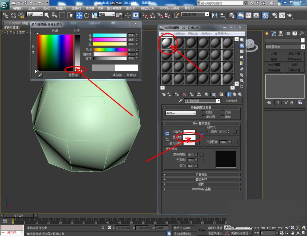 2、點(diǎn)擊【材質(zhì)編輯器】,彈出材質(zhì)編輯器設(shè)置欄,按圖示設(shè)置一個(gè)白色材質(zhì)球并附加給模型。選中模型,點(diǎn)擊【對(duì)象顏色】將模型的對(duì)象顏色設(shè)置為黑色。點(diǎn)擊鼠標(biāo)右鍵-【轉(zhuǎn)換為】-【轉(zhuǎn)換為可編輯多邊形】;