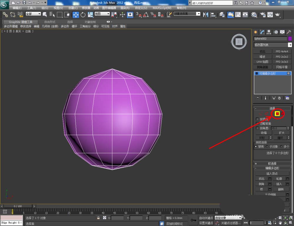 2、選中球體模型,點(diǎn)擊鼠標(biāo)右鍵-【轉(zhuǎn)換為】-【轉(zhuǎn)換為可編輯多邊形】。點(diǎn)擊右邊工作區(qū)中的【面】圖標(biāo),選中球體模型右半部分的面并將其刪除(如圖所示);