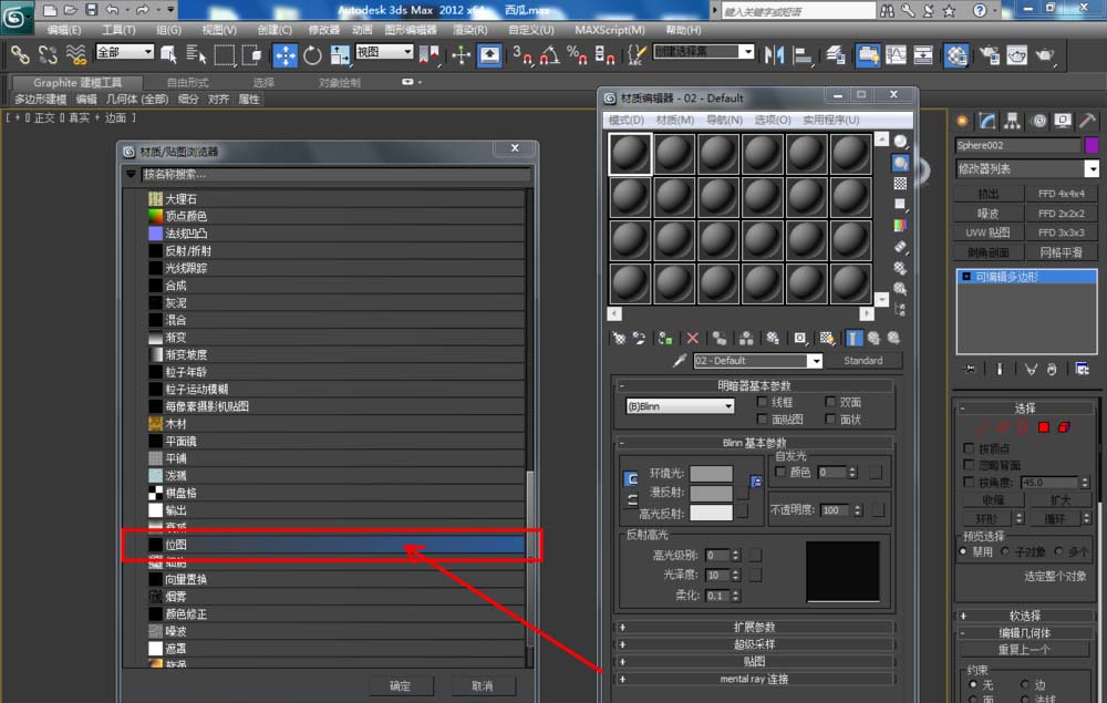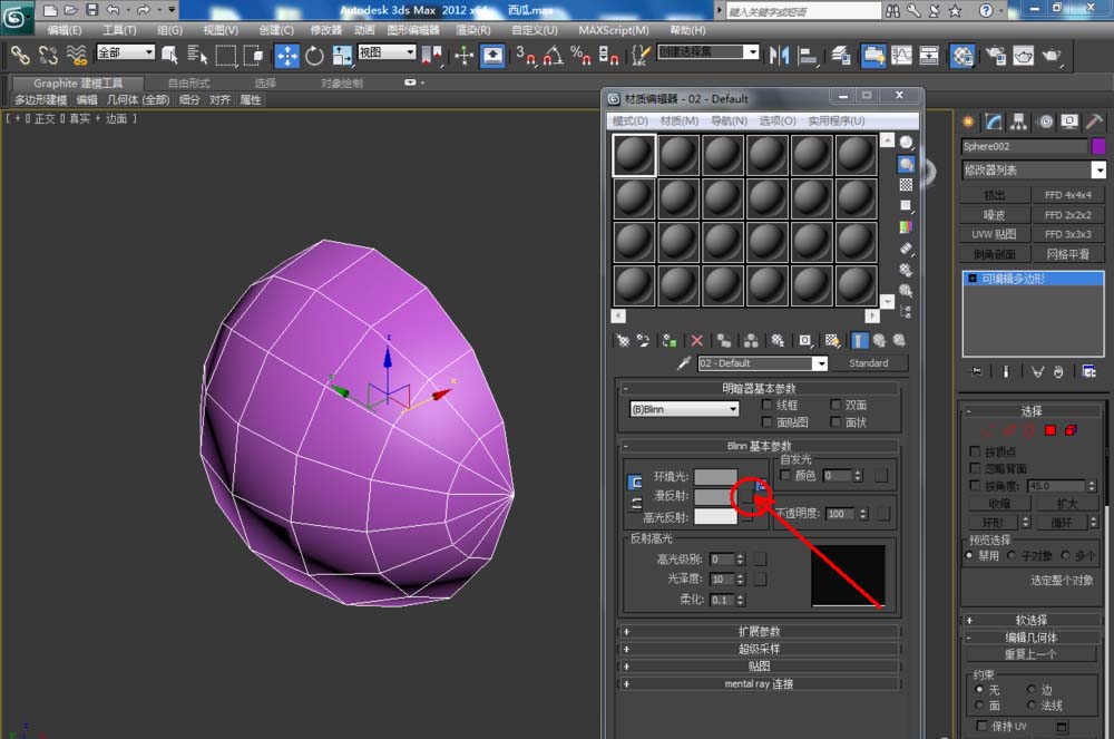 3、點(diǎn)擊【材質(zhì)編輯器】,彈出材質(zhì)編輯器設(shè)置欄,按圖示設(shè)置好材質(zhì)球系數(shù)后,點(diǎn)擊【漫反射】右邊的小方框-【位圖】,添加一張西瓜材質(zhì)圖。完成后將材質(zhì)附加給模型(如圖所示);