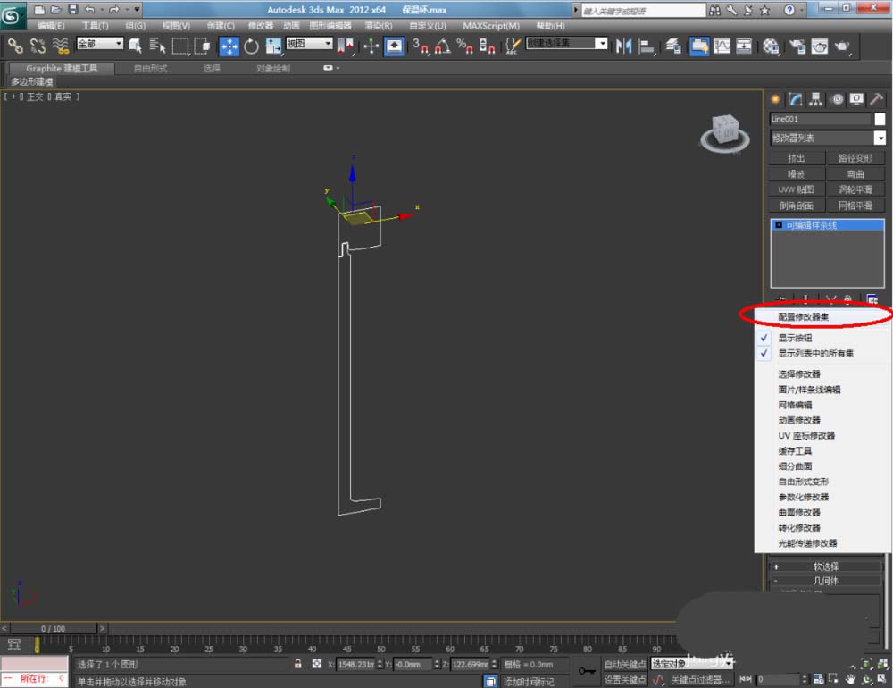 3、點擊【修改】-【配置修改器集】,彈出配置修改器集選項欄,找到【車削】并將其拉動到右邊的選項欄中,點擊【確定】將車削調出;