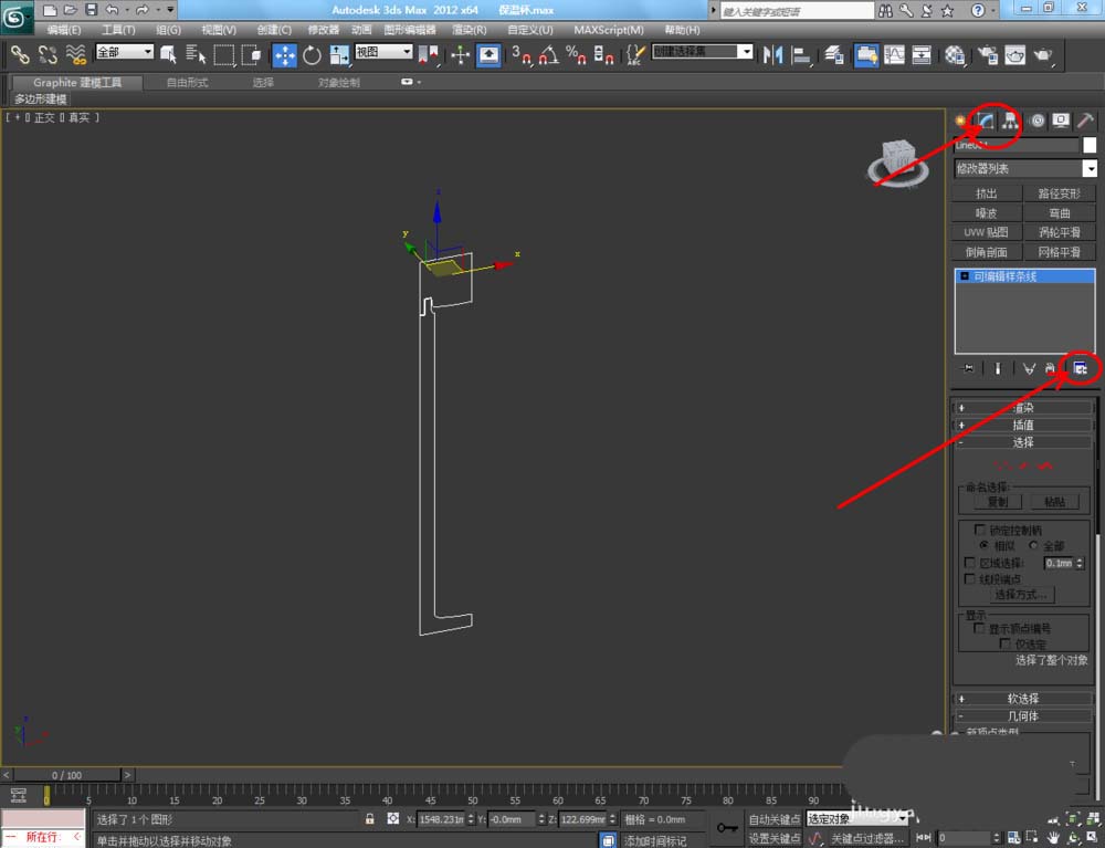 1、打開3Dmax2012軟件,點擊【創建】-【圖形】-【線】,在作圖區域繪制一個多邊圖案。點擊右邊工作區中的【頂點】,對圖示圖案上的點進行圓化處理,制作出保溫瓶蓋的截面圖案;