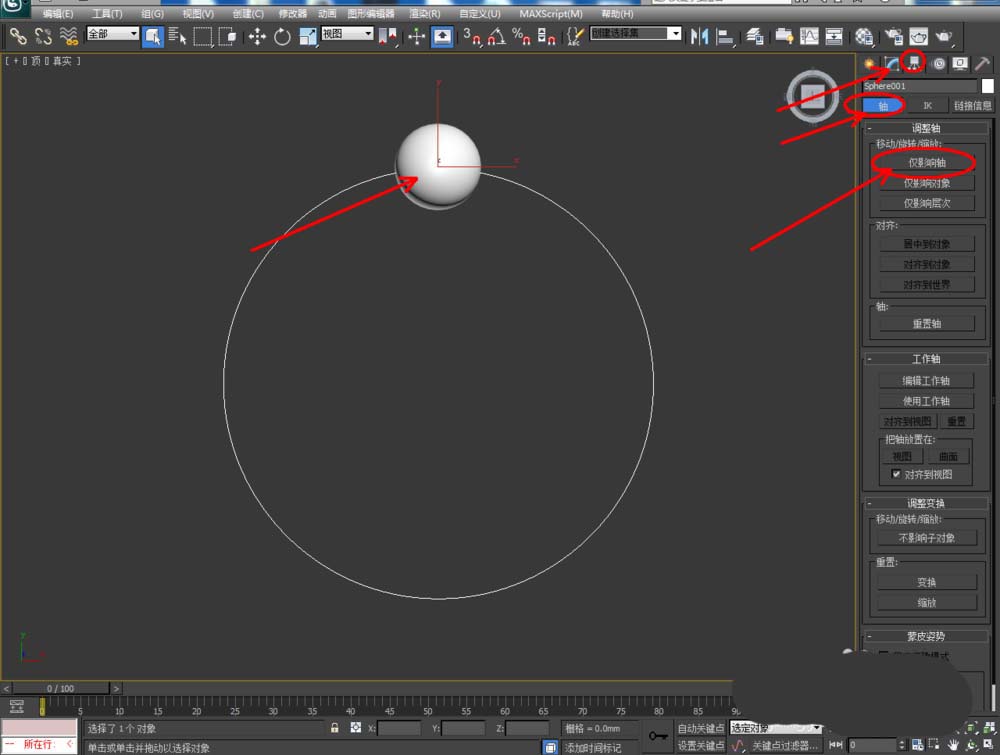 3、選中珠子,點(diǎn)擊【層次】-【軸】-【僅影響軸】,將珠子的軸移動(dòng)至系帶圈的中心點(diǎn);點(diǎn)擊【工具】-【陣列】,彈出陣列對(duì)話框,將z軸設(shè)置為360,數(shù)量設(shè)置為15后點(diǎn)擊確定;