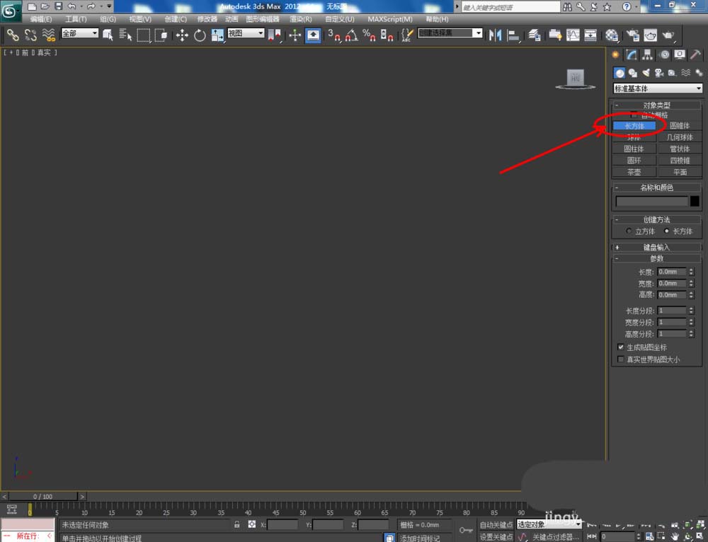 1、打開3Dmax2012軟件,點擊【創建】-【幾何體】-【長方體】,在作圖區域繪制一個長方體模型。點擊【對象顏色】將模型的對象顏色設置為:白色;