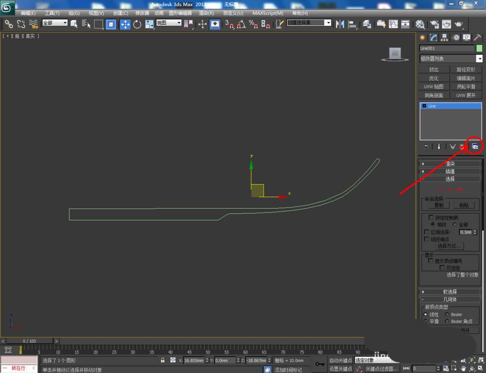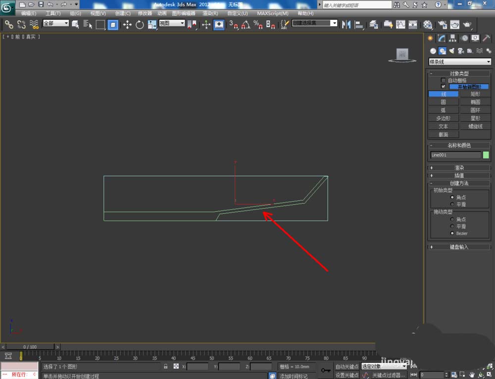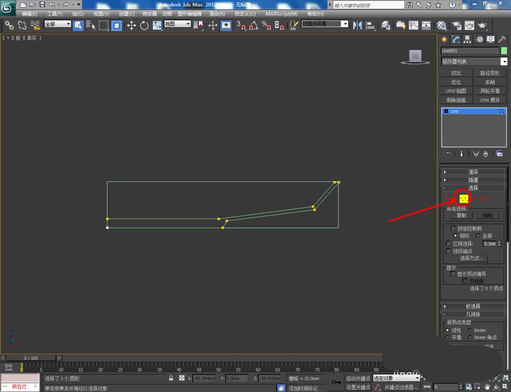2、點擊【創建】-【圖形】-【線】,按圖示以矩形圖案為參考,繪制一個多邊圖案。點擊右邊工作區中的【頂點】圖標,選中圖示圖案上的點,將選點進行圓化平滑處理,完成盤子截面圖案的制作。完成后刪除矩形參考圖案;