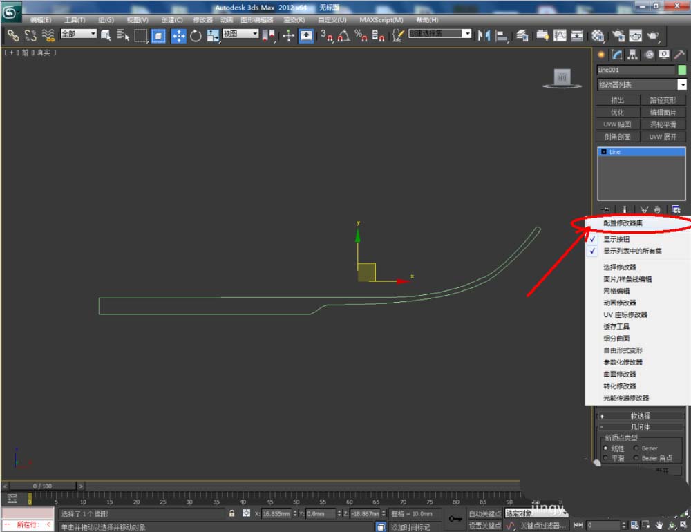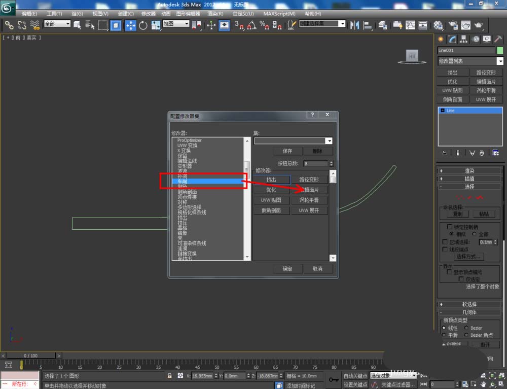 3、點擊【修改】-【配置修改器集】,彈出配置修改器集設置欄,找到【車削】并將其拉動到右邊的選項框中,點擊【確定】將車削功能調出;