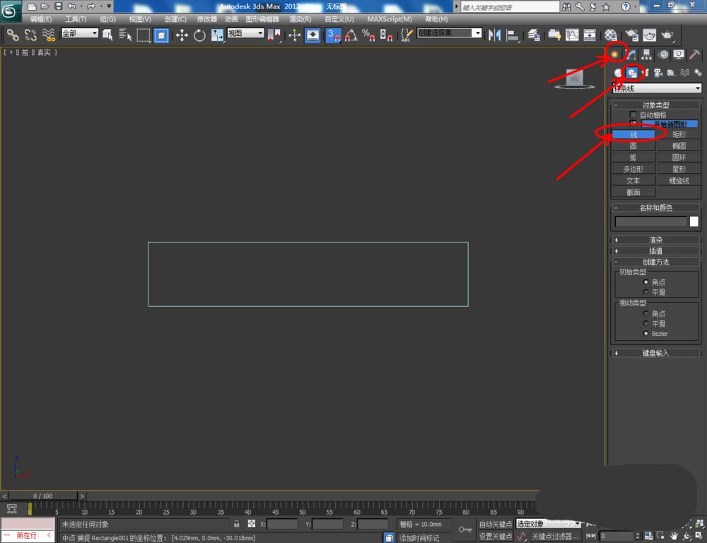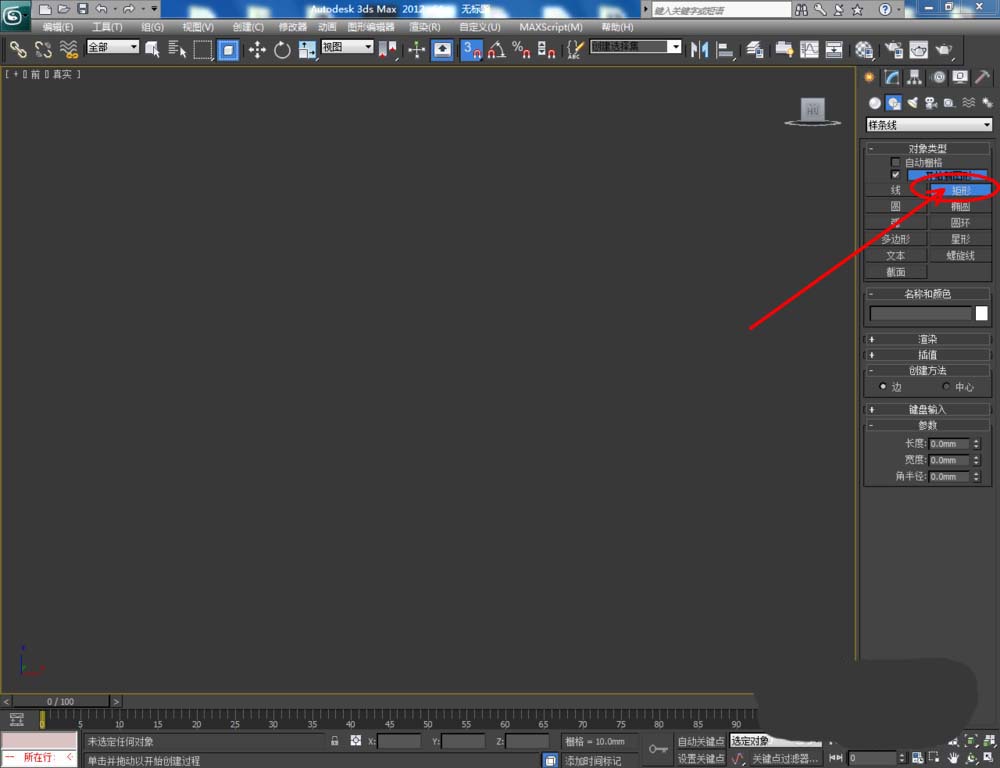 1、打開3Dmax2012軟件,點擊【創建】-【圖形】-【矩形】,在作圖區域繪制一個矩形參考圖案并按圖示設置好矩形圖案的各個參數(如圖所示);