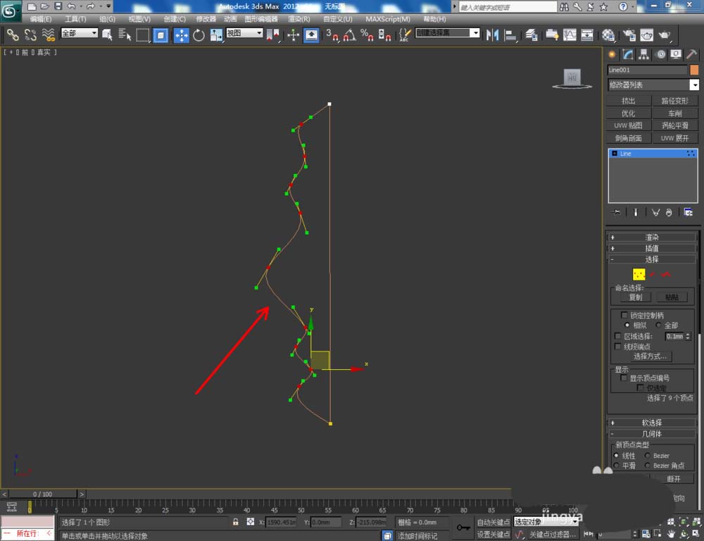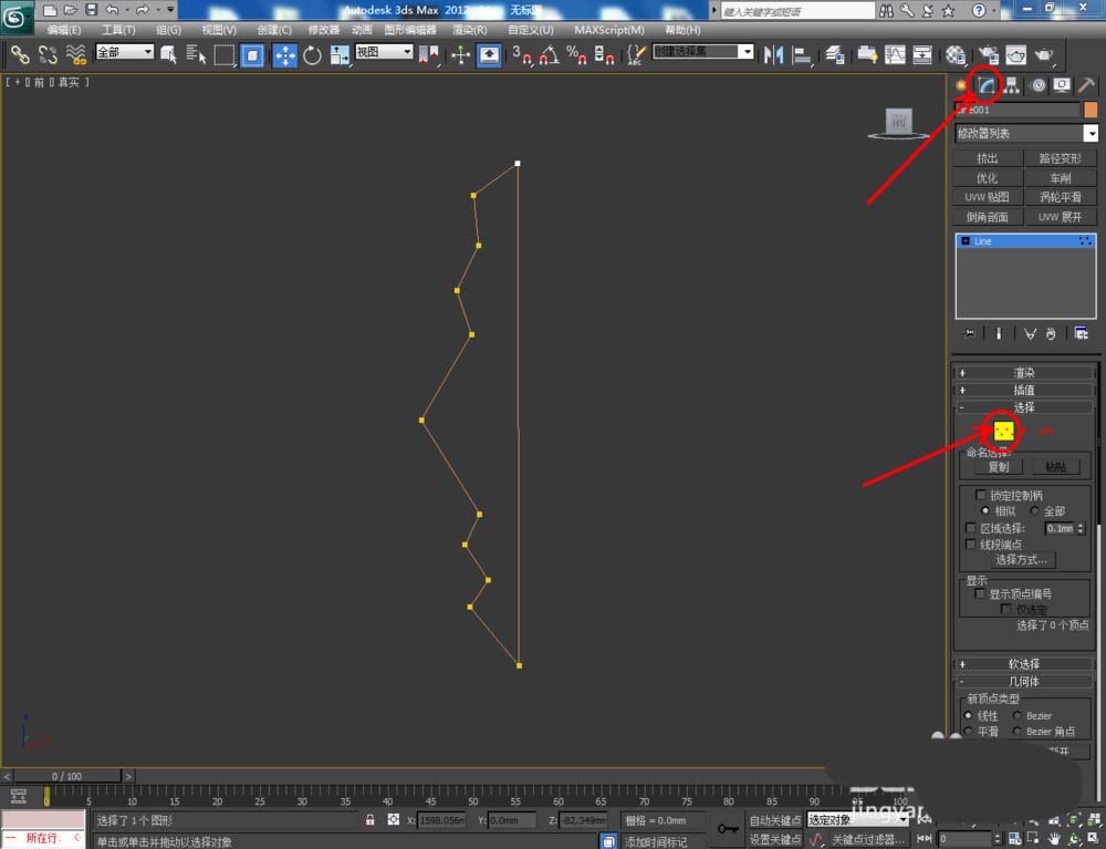 3、點擊【修改】,鼠標點擊右邊工作區中的【頂點】圖標,選中圖示圖案上的節點,對選點進行圓化平滑處理。通過調整控制點,完成腰線截面圖案的制作(如圖所示);