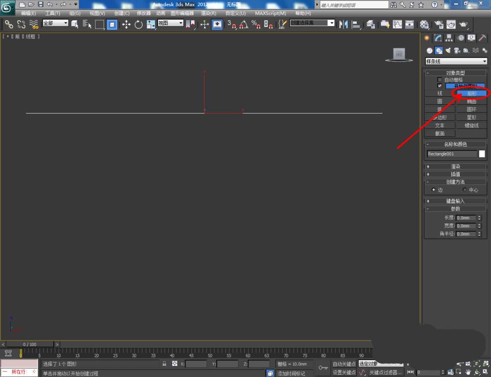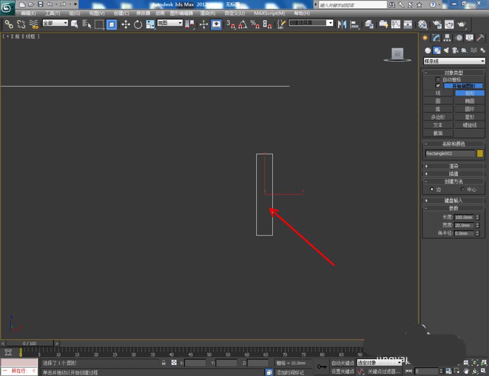 1、打開3Dmax2012軟件,點擊【創建】-【圖形】-【矩形】,按圖示在作圖區域繪制一個矩形圖案作為腰線路徑并設置好矩形的各個參數。選中矩形圖案,點擊【對象顏色】將圖案的對象顏色設置為:白色;