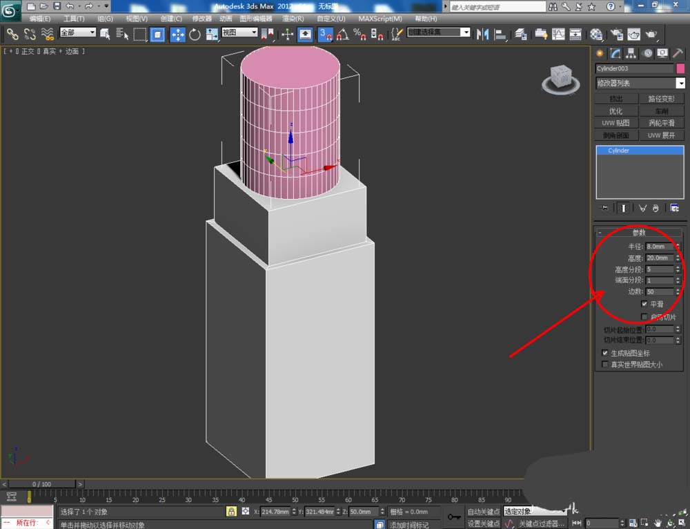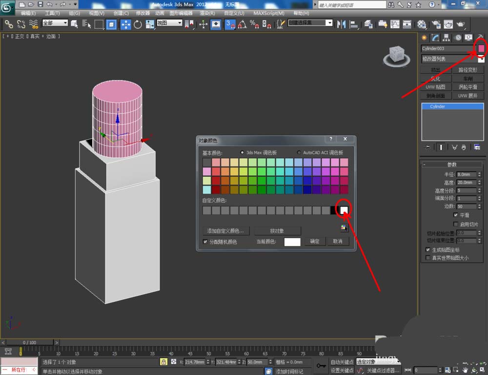 3、點擊【創建】-【幾何體】-【圓柱體】,在圖示區域繪制一個圓柱體模型并設置好模型的各個參數。點擊【對象顏色】將模型的對象顏色設置為:白色。同樣的步驟,完成第二個圓柱體模型的制作后,選中兩個圓柱體模型,點擊鼠標右鍵-【轉換為】-【轉換為可編輯多邊形】;