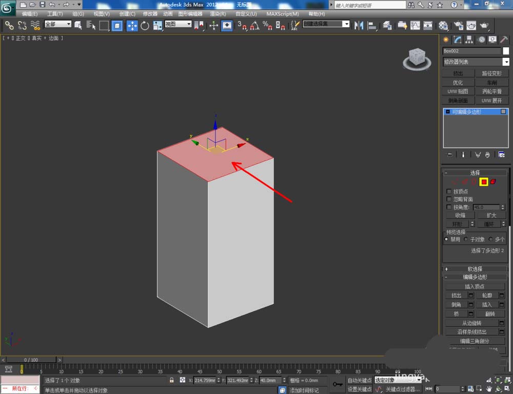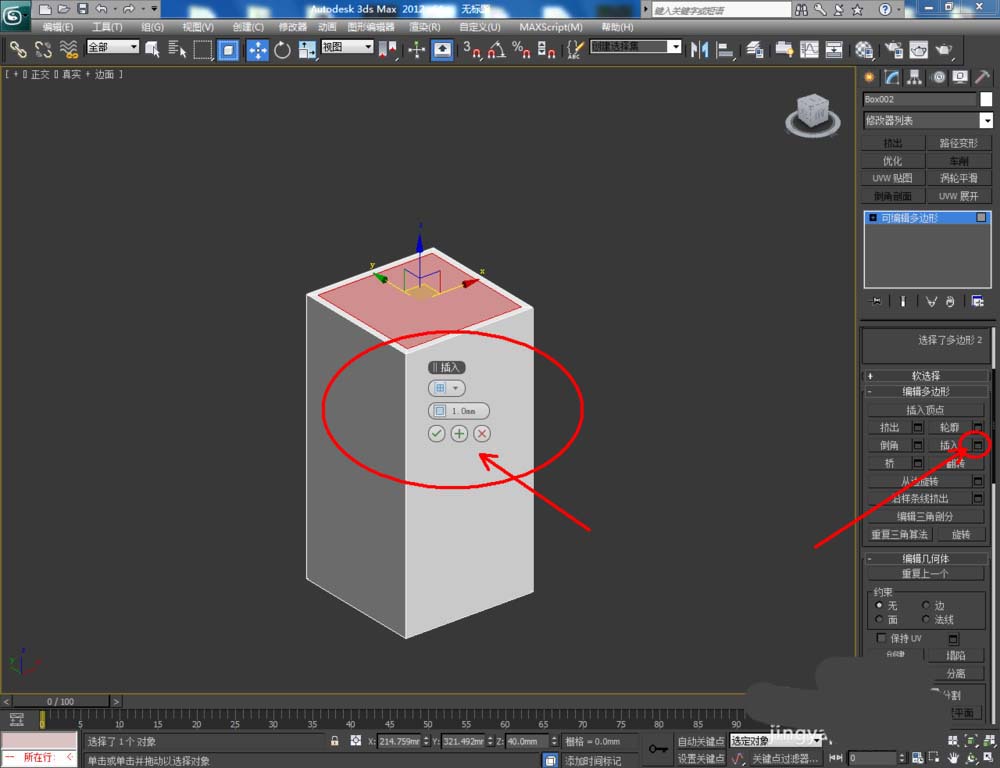 2、點擊右邊工作區中的【面】圖標,選中長方體頂面后,點擊【插入】右邊的小三角,按圖示設置好插入的各個參數。繼續點擊【擠出】對插入面進行擠出操作,擠出參數如圖所示;