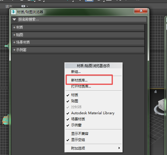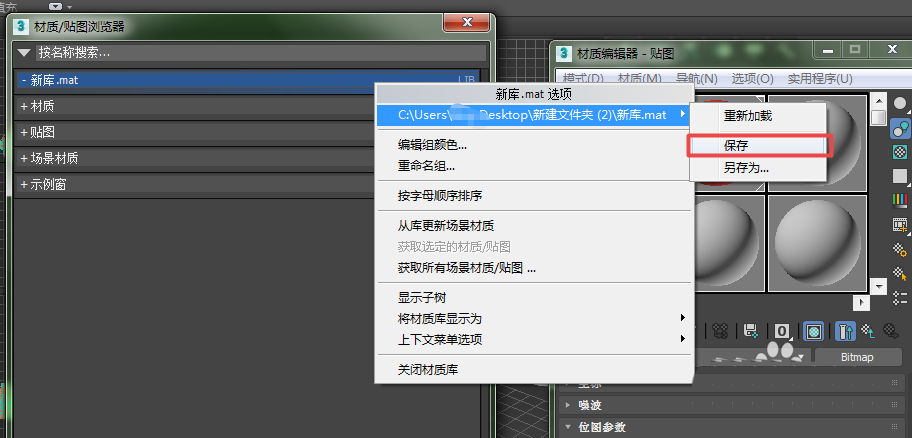 6、于是在材質/貼圖瀏覽器中就可看到新庫,右鍵點擊該選項,選擇保存。
