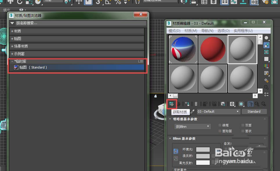 3、再點擊獲取材質,即可在彈出的對話框中找到臨時庫,即可運用所保存的庫。