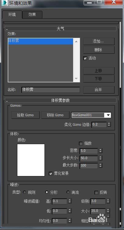 3、隨后會彈出“環境和效果”的對話框(如下圖);大氣一欄內“體積霧”及下方的體積霧參數就可以對霧進行參數調整;注意調整過程中要并列開啟渲染器實時渲染,以便對應調整的參數效果。